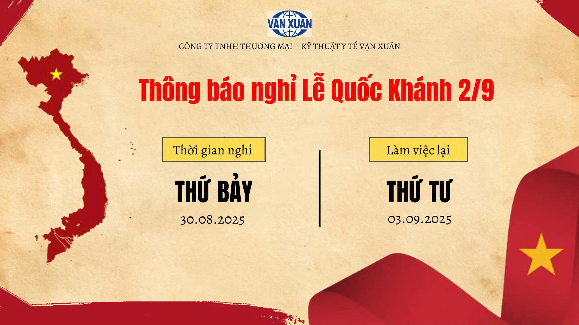 Công ty TNHH Thương Mại Kỹ Thuật Y Tế Vạn Xuân xin trân trọng thông báo thời gian nghỉ Lễ Quốc Khánh 2/9/2025 như sau:
